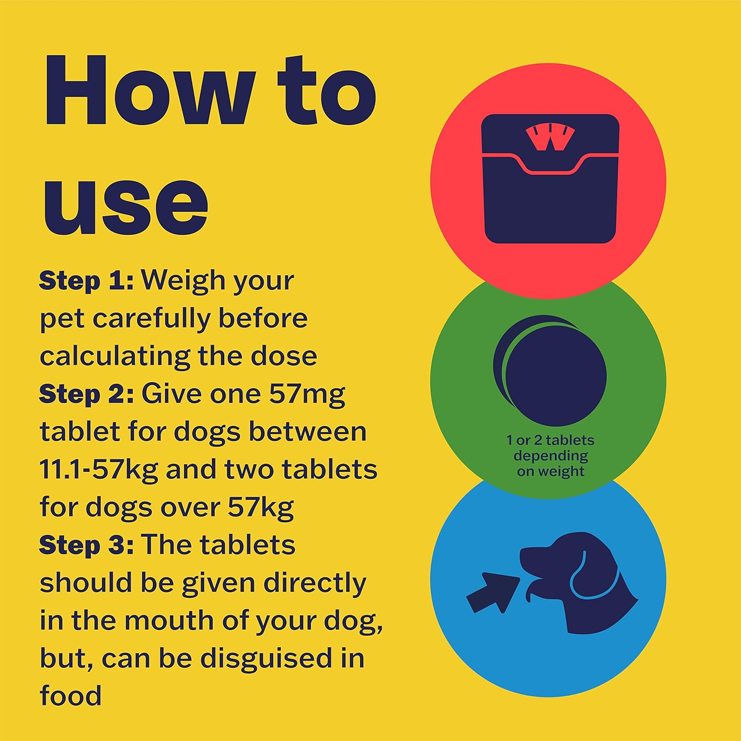 - CORRECT DOSAGE - Weigh your pet carefully, and give one tablet for dogs weighing between 11-57kg, or two tablets for dogs over 57kg. Please always refer to the instructions for more detailed information.