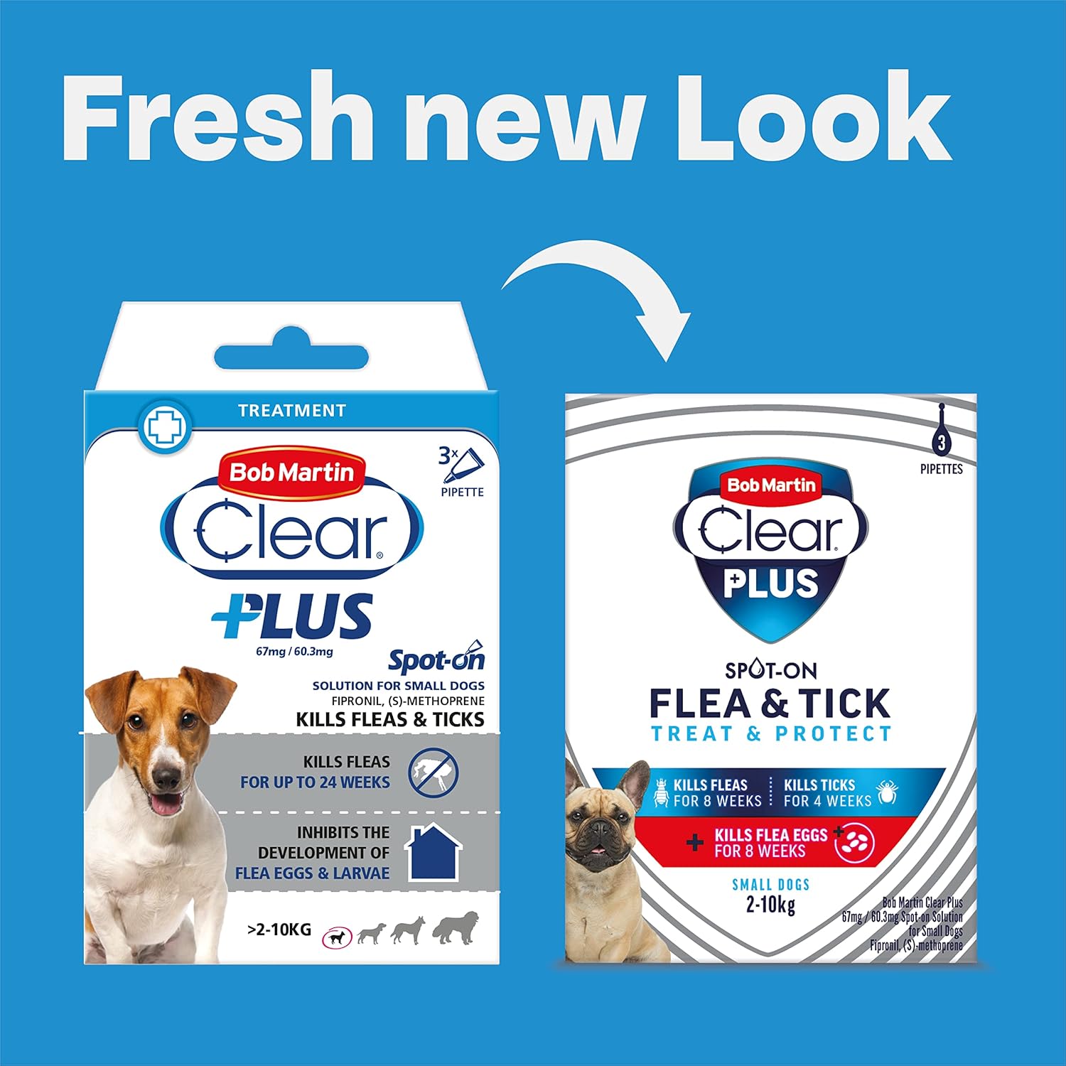 Bob Martin Clear Plus Spot On Flea Treatment for Small Dogs (2-10kg) - Kills Fleas, Ticks, Lice and Flea Eggs (3 Pipettes)