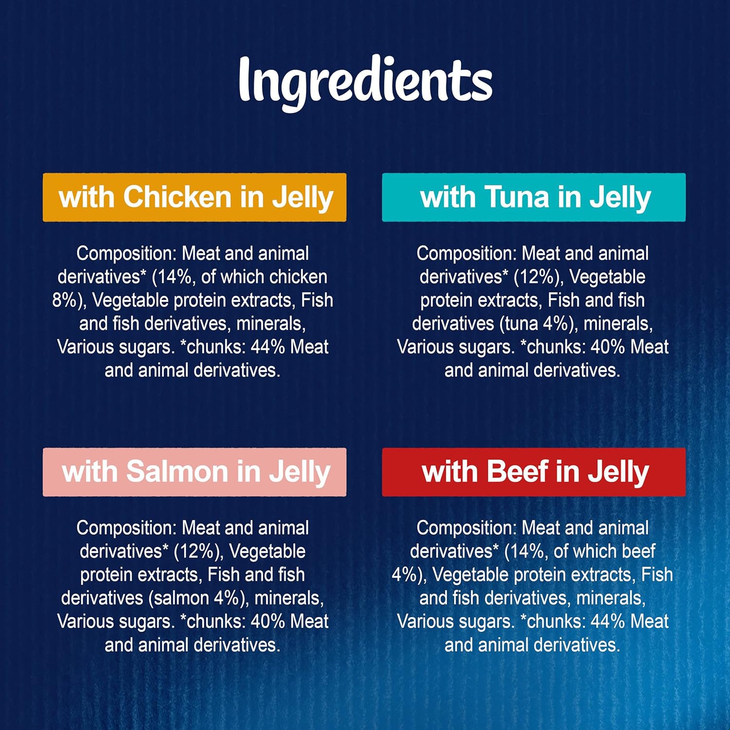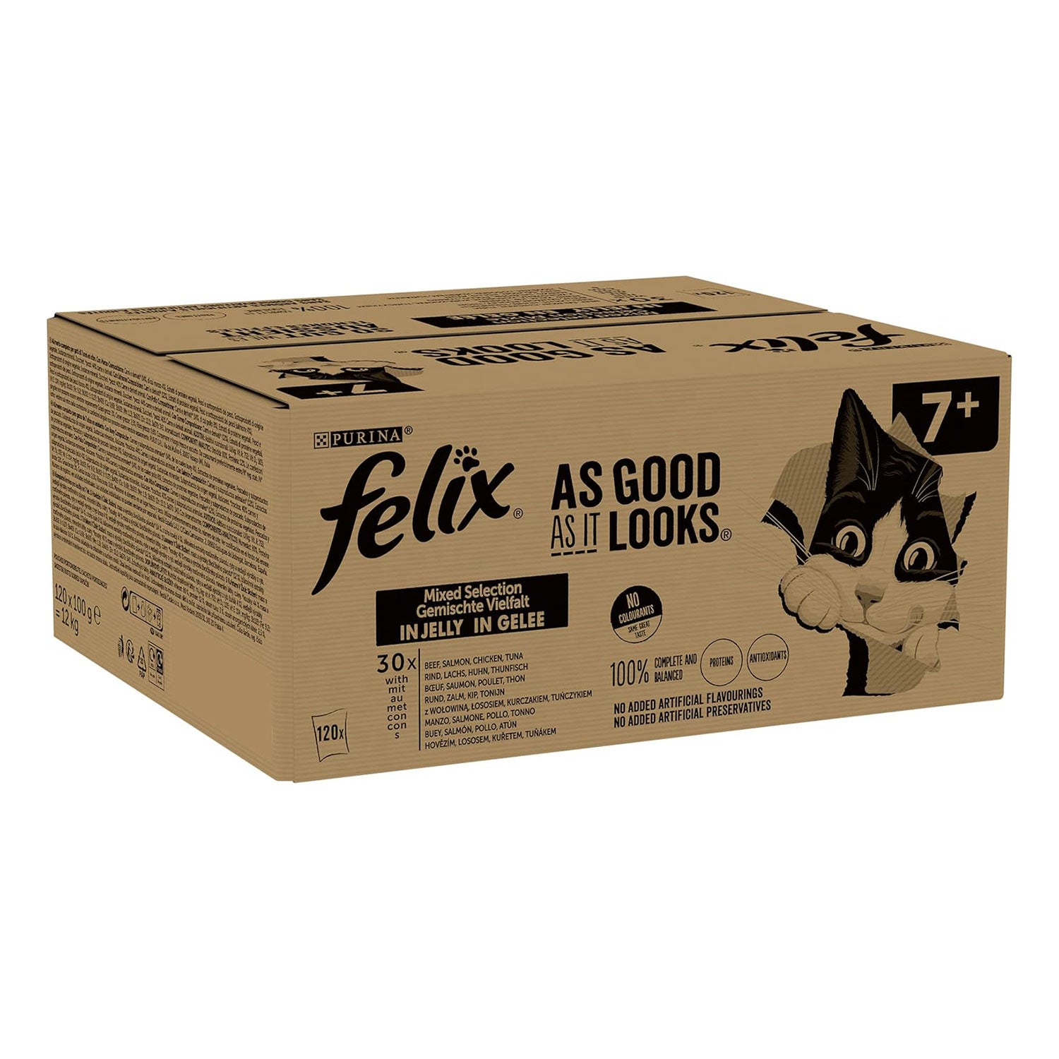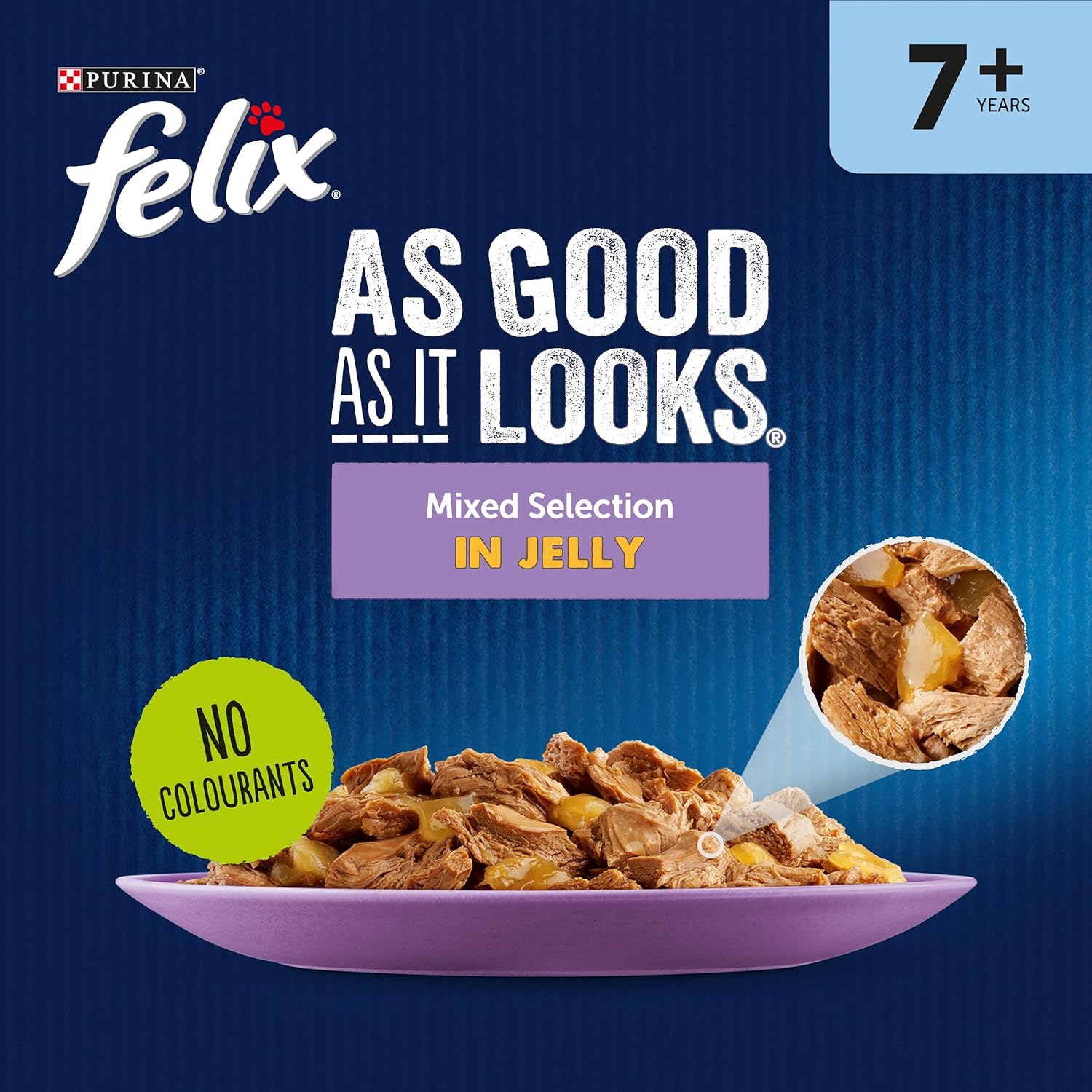 - ^ Felix As Good As It Looks 7+ Senior Wet Cat Food Mixed Variety in Jelly Beef, Chicken, Tuna, Salmon 120 x 100g Pouches ^ We include minerals and vitamins D & E to help keep your cat supported ^ Our senior wet cat food is great for cats that need caring for in their later years ^ 12 assorted meals served in individual pouches for convenience ^ Complete cat food to help support your senior cat as he grows older. ^ 120 x 100g