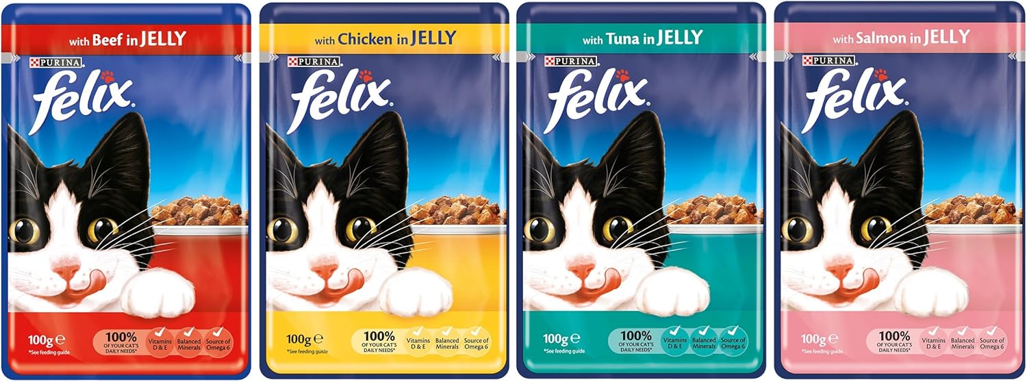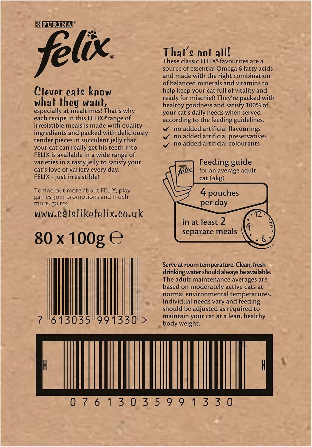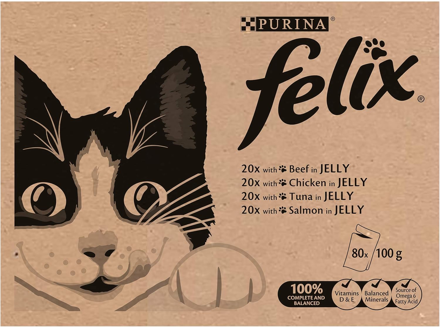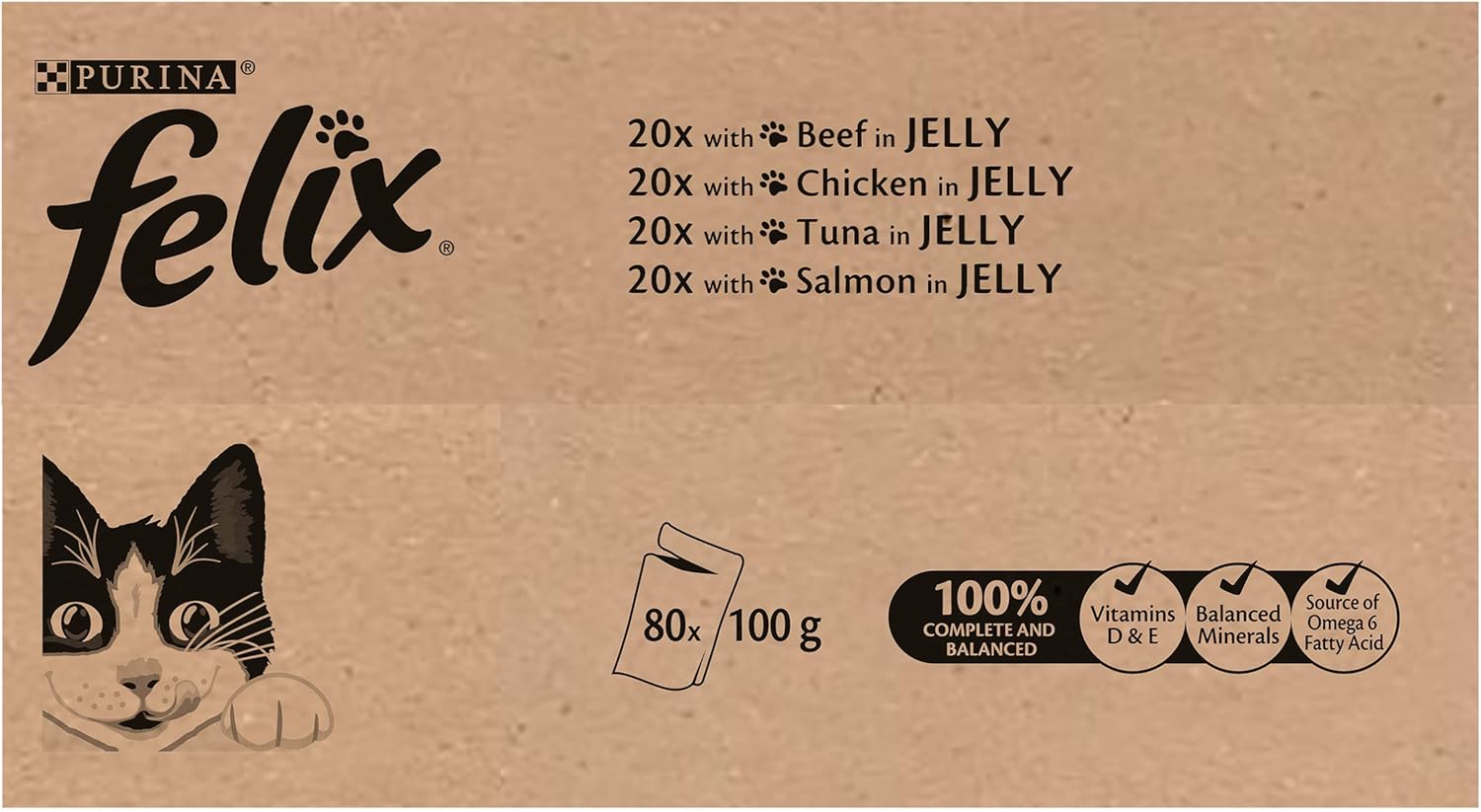 80 x 100g of pouches of Felix wet cat food in jelly in four individual varieties: Beef, Chicken, Tuna and Salmon with Trout, altogther in one outer box