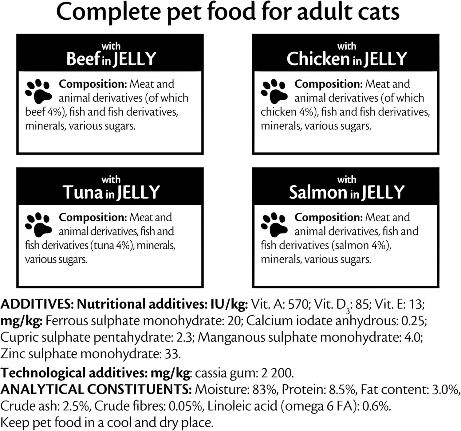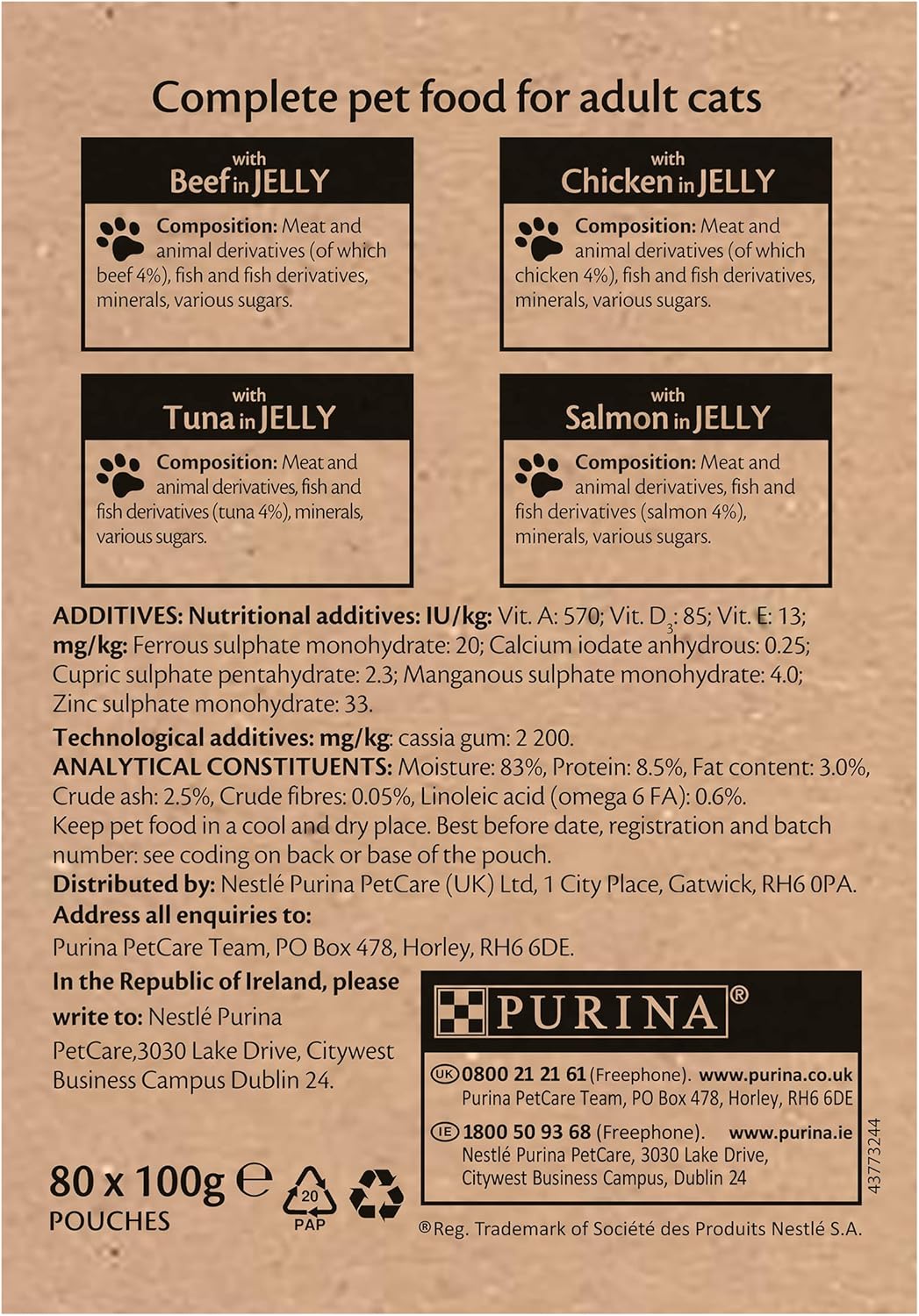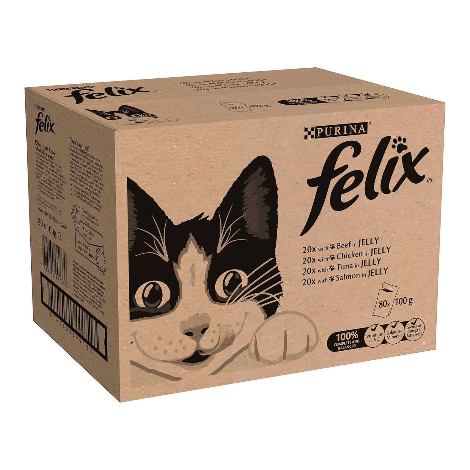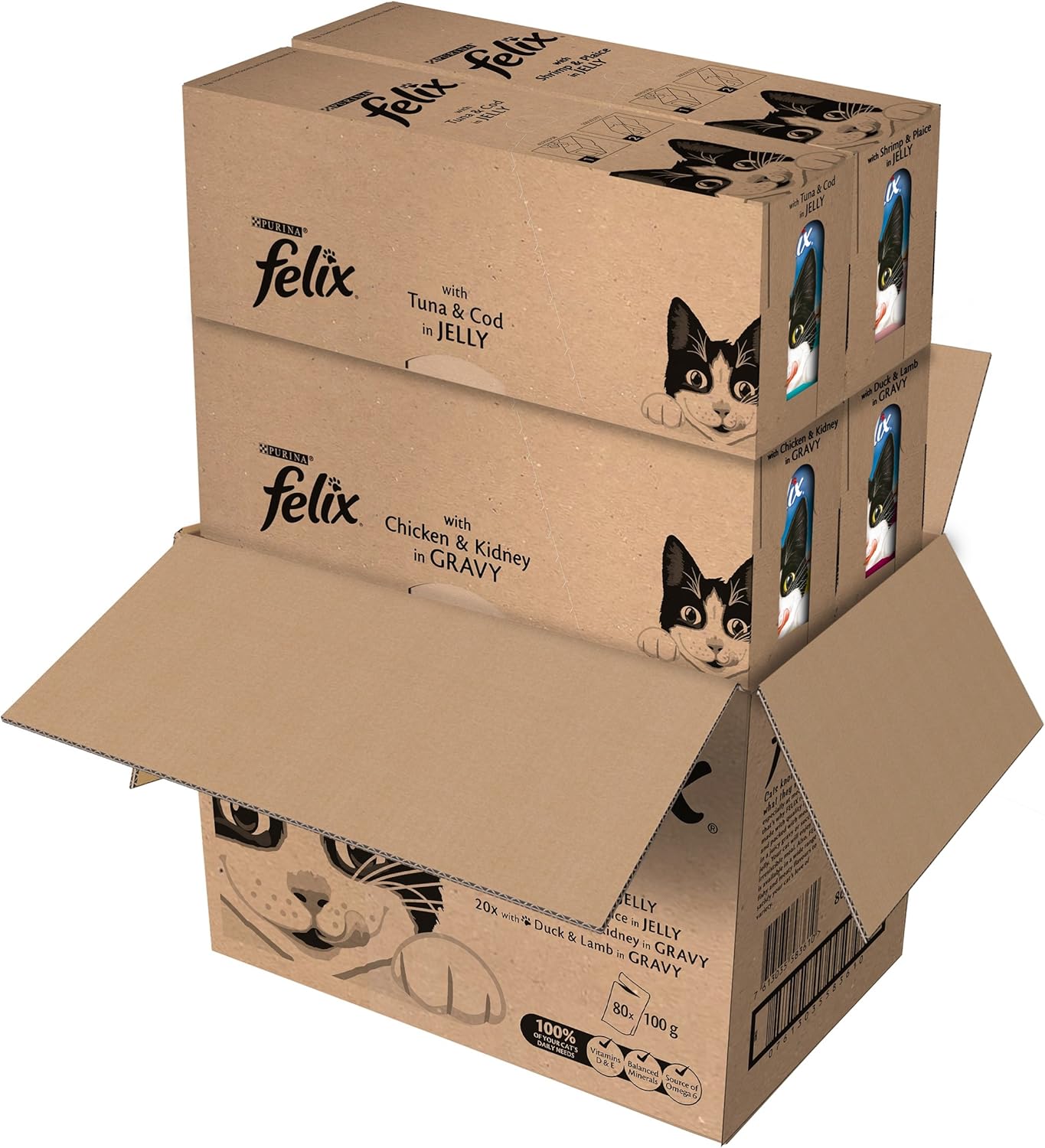 80 x 100g of pouches of Felix wet cat food in jelly in four individual varieties: Beef, Chicken, Tuna and Salmon with Trout, altogther in one outer box