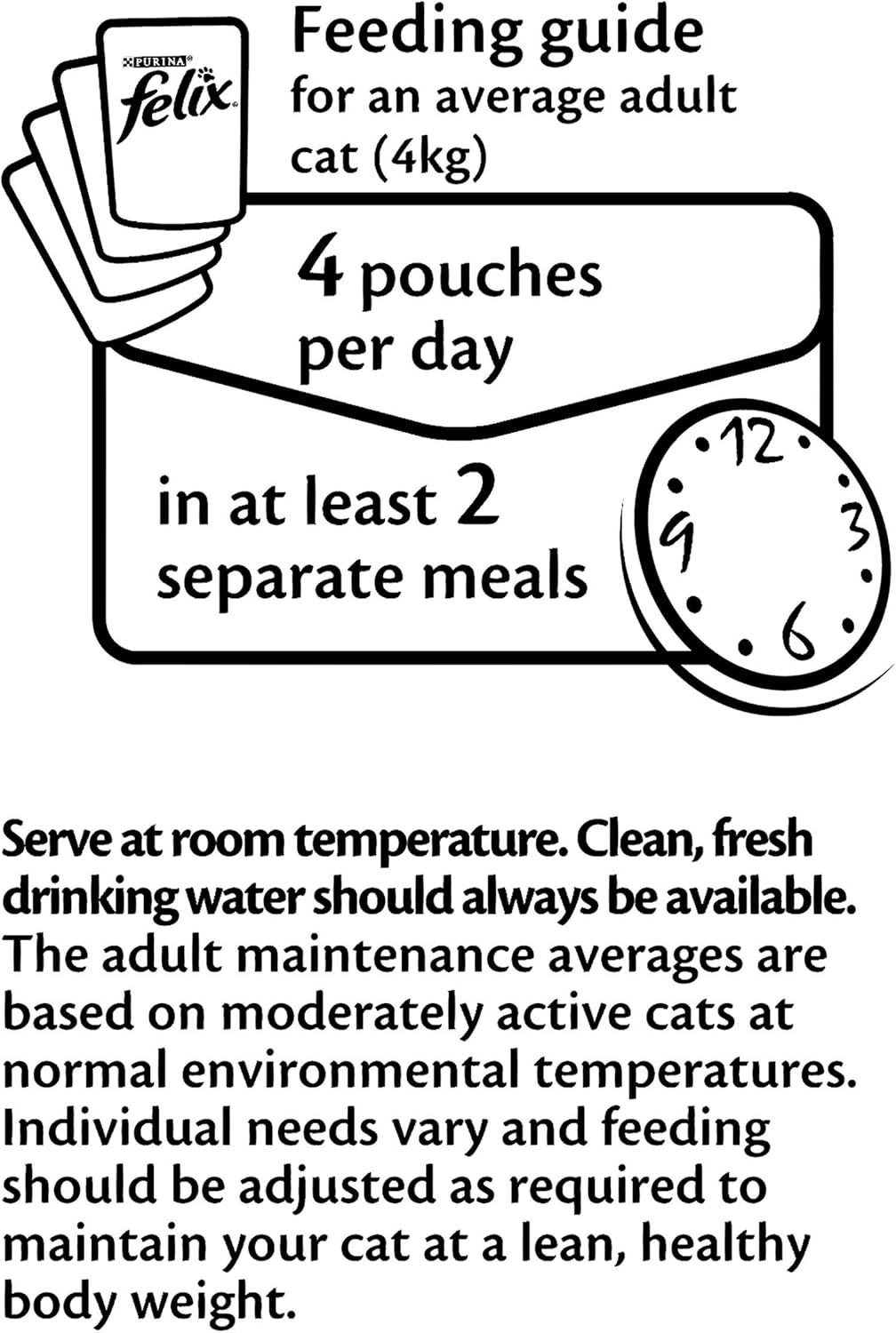 For an average adult cat (4kg), feed 3 to 4 pouches per day in at least 2 separate meals. The adult maintenance averages are based on moderately active cats at normal environmental temperatures. Individual needs vary and feeding should be adjusted as required to maintain your cat at a lean, healthy body weight. Serve at room temperature.