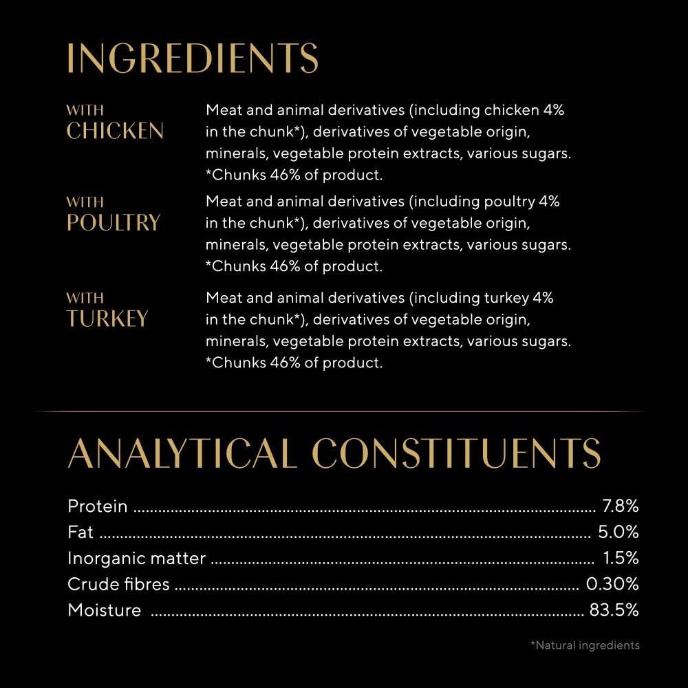 With Chicken Meat and Animal Derivatives (45%, including 4% Chicken), Derivatives of Vegetable Origin, Minerals, Various Sugars With Poultry Meat and Animal Derivatives (45%, including 4% Poultry), Derivatives of Vegetable Origin, Minerals, Various Sugars With Turkey Meat and Animal Derivatives (45%, including 4% Turkey), Derivatives of Vegetable Origin, Minerals, Various Sugars