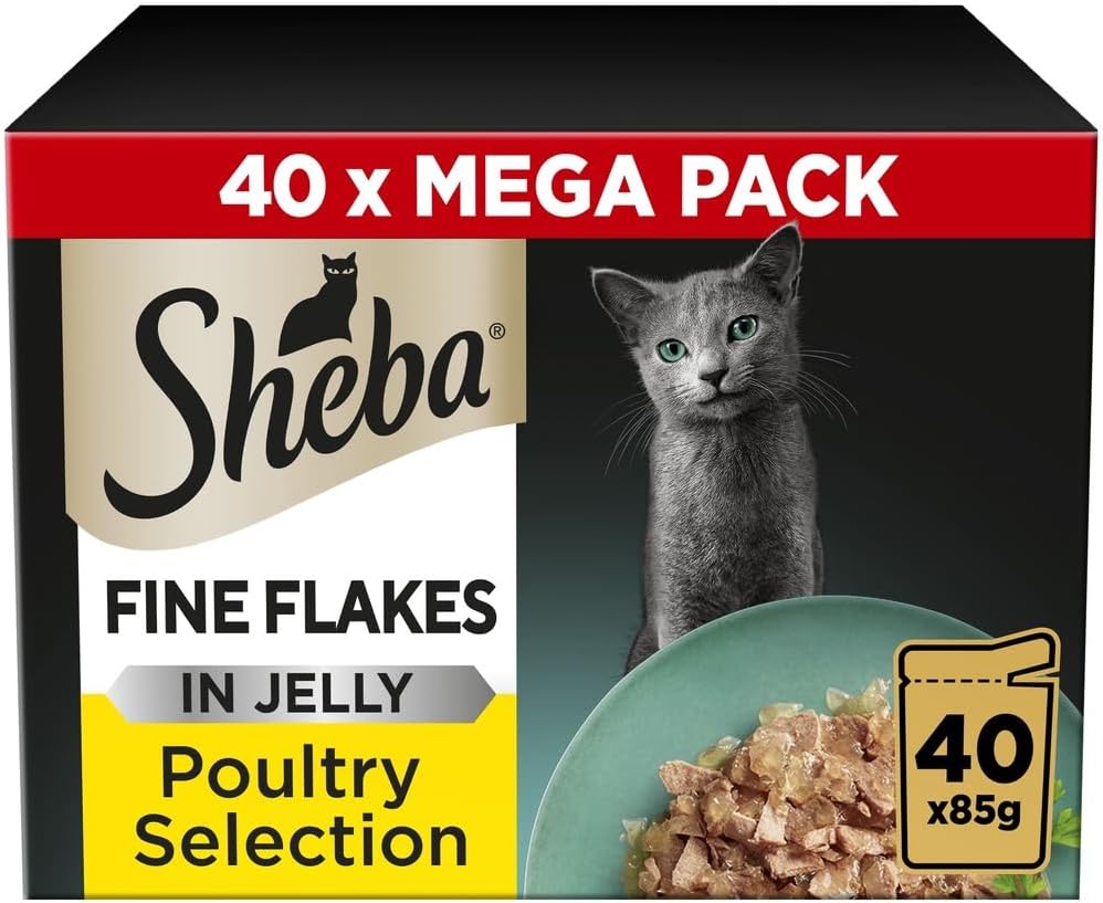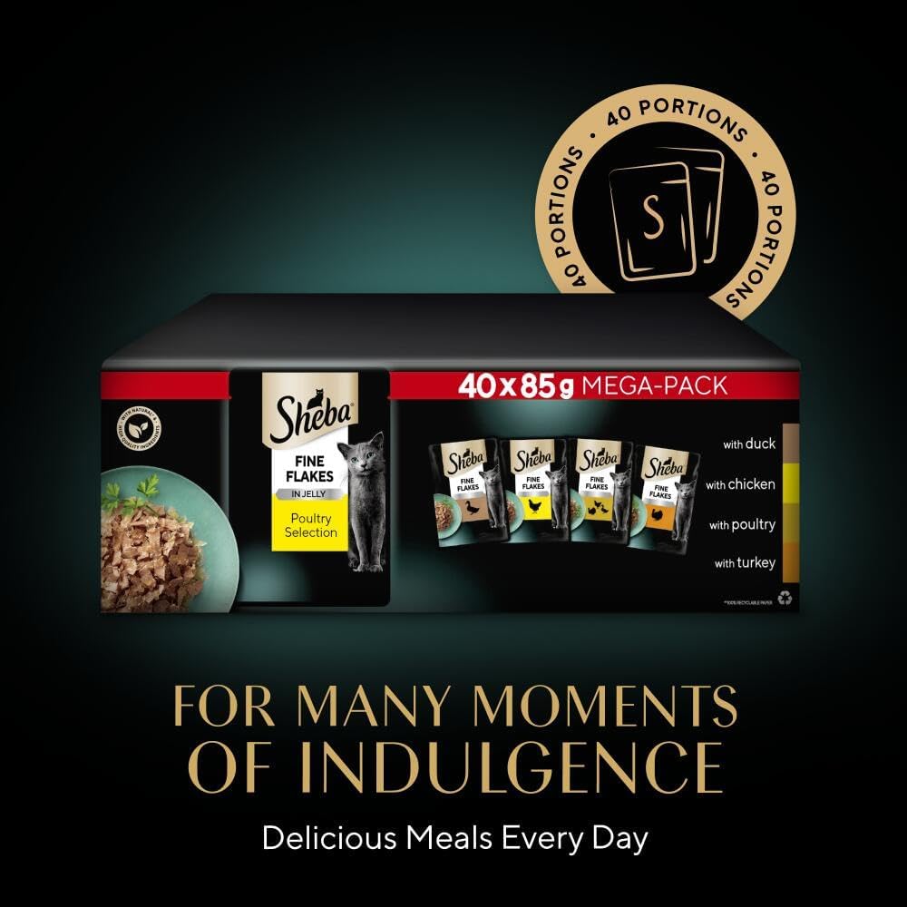 - Items delivered: 40 x 85g Sheba Fine Flakes Poultry Collection in Jelly / Multipack with poultry variety / Suitable for any adult cat
