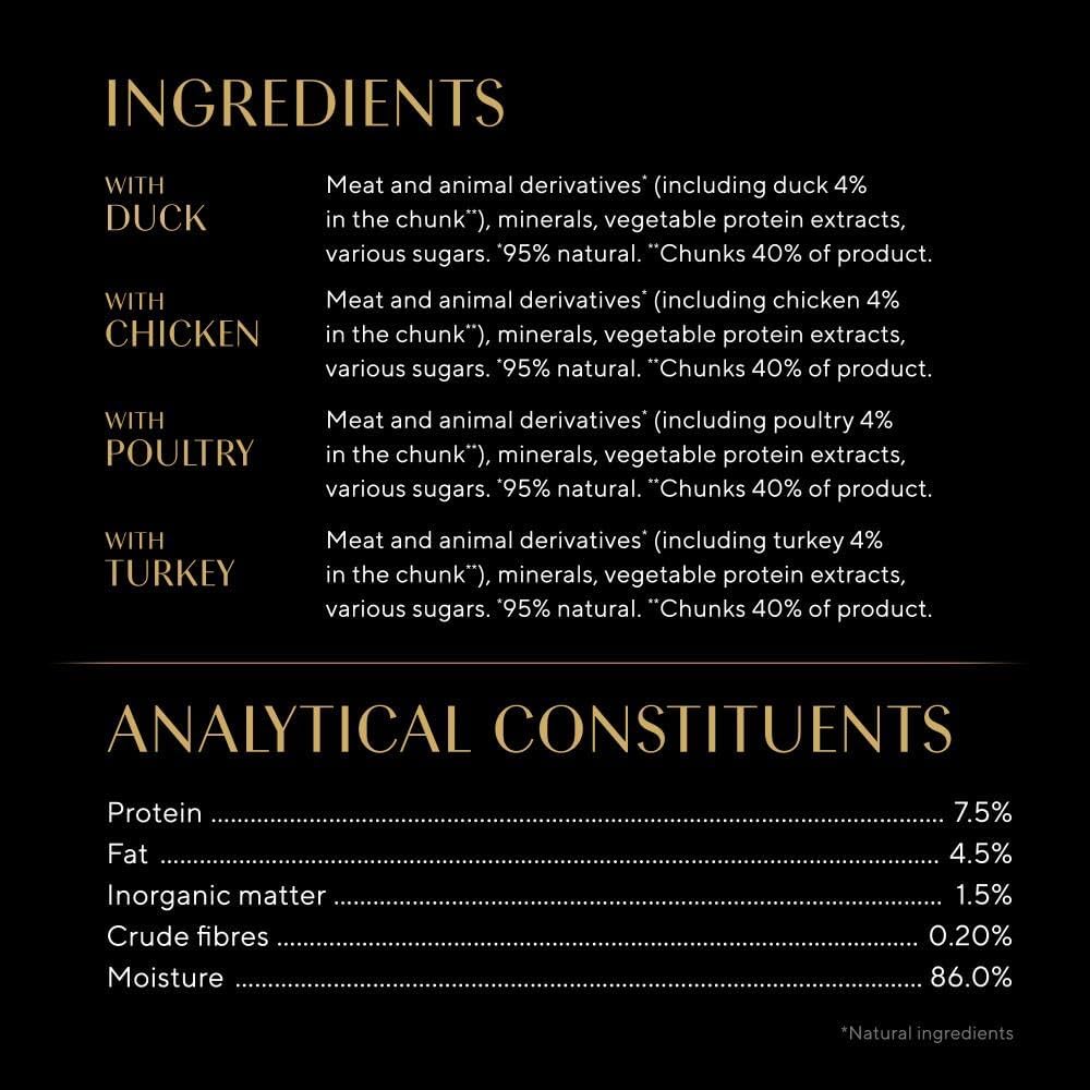 - Multipack with 4 exquisite varieties: chicken, duck, turkey and poultry pouches in a delicious gravy sauce / Without artificial colours or preservatives