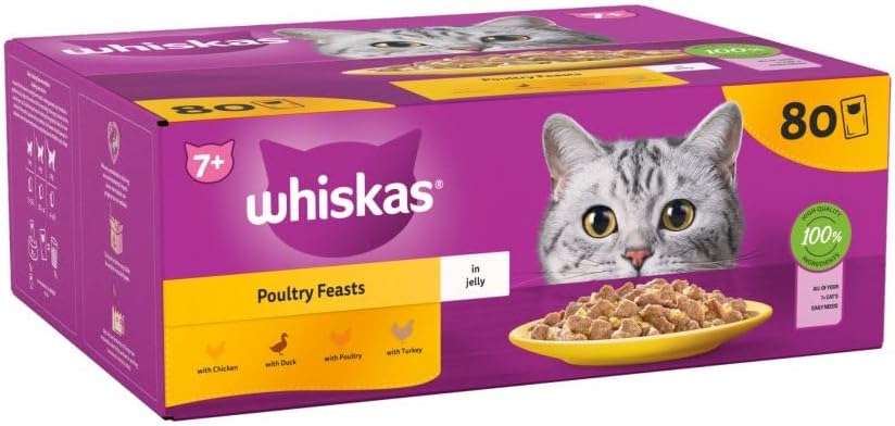 Whiskas 7+ Poultry Feasts Senior Wet Cat Food Pouches in Jelly 80 × 85g Pouches